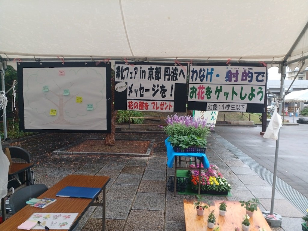 ブースにお越しいただいた方には、輪投げ・射的といったミニゲームや『第43回全国都市緑化フェアin京都丹波』へのメッセージで、お花の苗や種をプレゼントし、花やみどり、そして京都丹波フェアをPRしていただきました。