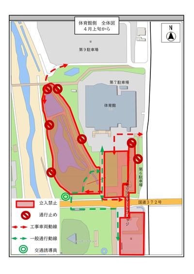 体育館西側は電気工事を行うため立入禁止となります。体育館・競技場側から第7,第9駐車場への往来は体育館東側の通路を通っていただくようお願いいたします。